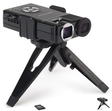Pretty simple, really. It’s a projector that you can hook up to stuff with small screens so you can see it better, or you could carry it in your laptop case with you to give on-the-fly presentations. It is, in the words of Hammacher’s description, “like having a flatscreen monitor tucked into your pocket”.