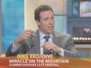 As an interviewee, you are largely at the mercy of the interviewer to get the full story across. In my discussions with the show’s writers I was allocated 20 seconds to describe what went wrong with the anchor. 20 seconds??? 95% of the GMA audience has never even seen climbing equipment before. How do you convey to an audience of millions of people who are completely ignorant to the sport what went wrong with the setup? You make it as easy as possible for the audience to grasp and simply state, “I chose the wrong material for my anchor”. I wasn’t sitting at the top of the ice fall saying to myself “hmm, I’m tired of using biners on these top rope anchor slings, I think I’ll just run the rope right through the slings and see what happens”. That would be very much akin to a “Nascar racer forgetting to turn left”.