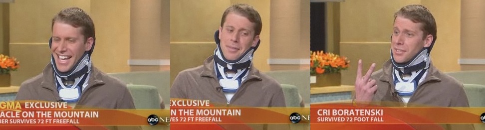 Two weeks ago, Cri Boratenski fell while lowering off the top of the Rigid Designator (Turgid Penetrator to locals), a 90-something foot icefall in Vail, CO. He fell 72 feet and landed flat on his back, then tumbled another 30 feet. He broke 9 vertebrae, his nose, and a rib, as well as lacerations on his face and a collapsed lung. Before you get all sympathetic or something, allow me to enlighten you as to how this happened. Cri was lowering on his rope, as one does. His rope, however, had been threaded through two nylon slings at the top of the route. As one does not. Seriously, one just fuckin’ does not. I’ve tested this personally, and it takes me 15 seconds to burn through a sling with a rope. That’s just pulling, too, about a fifth of body weight. This is the kind of mistake that NO ONE SHOULD EVER MAKE EVER. It is the most retarded thing you could do, especially if (like Cri) you have been climbing for 15 years. It is, in the words of one Rockclimbing.com forum poster, “like a NASCAR driver forgetting to turn left”. The worst of it all, though, is the fact that he went on Good Morning America to talk about his ordeal, sitting in his neck brace with the banner “Miracle on the Mountain” blazened across the bottom of the screen.