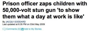 That could be an issue. Basically there were a bunch of kids touring a Tallahassee prison for Take Your Child to Work Day and Walter Schmidt (his friends call him “Einstein”) thought the kiddies might like to see what it’s like to deal with unruly inmates. So he zapped them. With 50,000 volts, or 450 times the shock of your little tyke jamming a fork in an electrical socket.