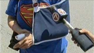 She’s also in a sling, and has somehow dragged herself all the way across the parking lot to the store despite her grievous injuries. She does not even seem to be wincing in pain as she talks, though perhaps the sunglasses are there to hide her tears.