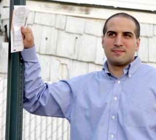 He is standing next to a “No Parking” sign, holding a parking ticket. In front of that sign, at the time the ticket was received, was his car. The problem is that when he parked his car there, the sign had not yet been installed.
