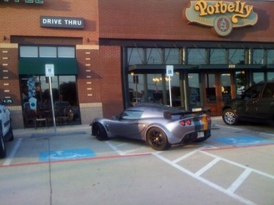 That is a Lotus Exige. It is one of the best-handling, nimblest cars in existence. Suffice it to say that if you own one, there is a snowball’s chance in hell that you fulfill any standards for handicappedness. It is impossible. And to pull a parking job like this outside a Starbucks/Potbelly? For shame.