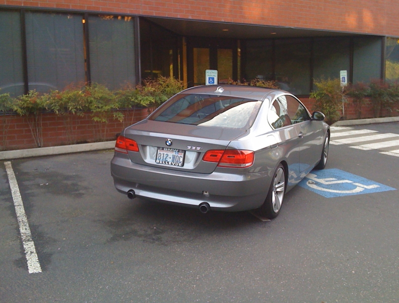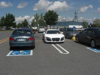 I’m torn here. On the one hand, this guy is clearly rich. He’s got an Audi R8. He has also taken up a portion of four parking spaces, and handicapped ones at that. That should be enough to earn him the full ten asshat stars, but wait. Let’s look at this a little more closely.