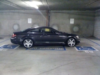 This is a very expensive Mercedes CL63 AMG. Rather than occupying one space and one handicapped one, he has taken two handicapped spaces (reserved ones at that) and the “No Parking” space in between. Amazing.