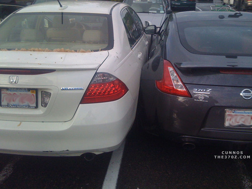 This person already gets asshat points in my book for driving an Accord hybrid, which gets 33 miles per gallon as opposed to the positively earth destroying normal Accord, which gets . . . *checks Honda’s website* . . . 31. Oh. So what you’re doing here is paying lots and lots more dollars for a car that’s slower and douchetacularer. What this person then did is to smear his/her Accord along the side of a brand-new 40th Anniversary Edition Nissan 370Z, which is quite a nice car. How it’s possible to scrape the entire length of a car without noticing until you’re already in, I don’t know, but apparently it’s possible. The only thing I can think of is that this person is older than most buildings, stone deaf, and slightly more aware of his/her surroundings than the car itself is, which would explain the choice of car and the parking job, but is not an excuse. If you can’t park an Accord, stay home. Forever.