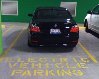 This guy drives a BMW 550i, which has a 4.7 liter V8. That huge V8 is powered—and this may shock you—not by electricity, but by gasoline, and lots of it. But that EV parking spot is closer to the door at Whole Foods, and it was free, so this guy parked there. That makes him kind of an asshat.