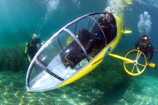 First of all, the Daily Mail article calls it “hermetically sealed.” This means that either they don’t know what that word means, or they failed to look at the picture or read the description or anything. “Hermetic” means airtight, and this submarine is only airtight in the sense that it’s not airtight in any sense. It’s completely open, which means that you have to be in full scuba gear to use it, so it’s like swimming but more huge and cumbersome. Oh, but it must be faster than swimming, right? Yes, it is. The average swimmer can probably go about two miles an hour, whereas this thing screams along at around [checks website] five. Oh. So not super exciting. Plus, you have to generate all that speed yourself, and you don’t even get the benefit of freedom of motion because your legs are wrapped in a wetsuit and surrounded by water, and you can’t breathe freely because you have a regulator in your mouth. Sounds delightful. Not only that, but you don’t get any pressure protection like, say, a submarine would have, because you’re in an open container. And this thing can’t go below twenty feet.