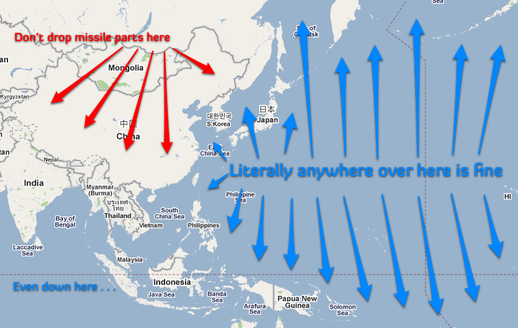 Then China came along. Now China is a very big country, so it’s possible to be very far from the coast, but if Russia can do it, so can they. Not to mention they actually have quite a lot of coast off of which to drop huge chunks of rocket, as demonstrated here.