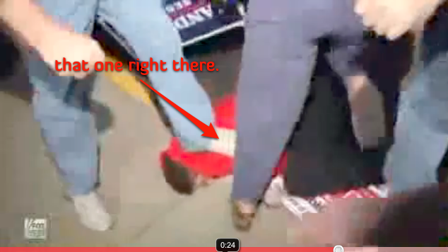 Now, that woman underneath his foot is a MoveOn activist who objects to some of Rand Paul’s policies. Maybe it’s the fact that he’s opposed to abortion in cases of rape and incest, maybe it’s the whole wanting-to-abolish-the-Department-of-Education thing, maybe it’s the electric fence on the southern border or his opposition to gun control of any kind, but whatever it is, Lauren Valle didn’t take too kindly to Rand, so she showed up to protest his rally, at which point Tim decided the best course of action was to curb stomp her like Edward Norton in American History X.