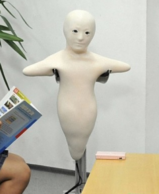 That is possibly the most terrifying thing ever conceived by humankind in the history of humans and things.  In an effort to make it gender-neutral, they have given it no hair, a pale complexion, and a mouth welded shut like Neo in the Matrix.  Oh and it’s not just a doll.  It’s a video chat.  ATR have concluded that people don’t really like video chat because they’d rather be heard than seen, probably so they can lay on a beanbag chair naked eating Cheetos and still talk to Grandpa.  So this pale creature, the Telenoid R1, lives in Grandpa’s house and hooks up to the internet.  Then you talk into a webcam at the other end and it tracks your facial motions and replicates them on the demon child at the other end.