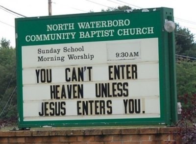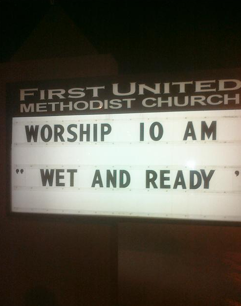 See, when a man and a woman love each other very much or it’s convenient or they’re drunk, there’s a special kind of hug that they do, and during that special kind of hug something happens to the woman that in porn circles (and immature innuendo ones) we call “getting wet.” That same thing also tends to imply that the woman is “ready” (for hugging, of course), so that’s where the sex HUGGING part of this sign comes in. What I don’t get is how this could possibly be church-related. Is it a baptism reference? Because people generally say “washed” for that, and that might clear some things up. Or maybe the First United Methodist Church is just really fun.
