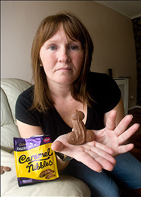 Elizabeth McClure, 38, was tucking into a packet of Cadbury’s Nibbles when she picked out the saucy sweet. But furious Elizabeth failed to see the funny side – and has now demanded an apology from the confectionary giant. She is convinced that the three-inch treat was deliberately fashioned by workers.