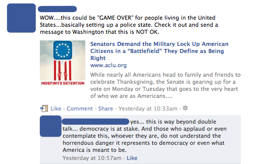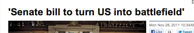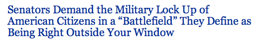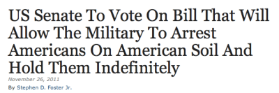 While nearly all Americans head to family and friends to celebrate Thanksgiving, the Senate is gearing up for a vote on Monday or Tuesday that goes to the very heart of who we are as Americans. The Senate will be voting on a bill that will direct American military resources not at an enemy shooting at our military in a war zone, but at American citizens and other civilians far from any battlefield — even people in the United States itself.