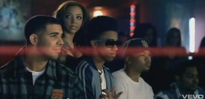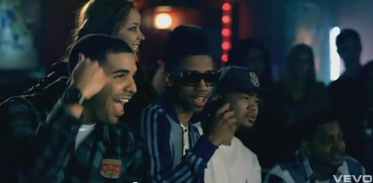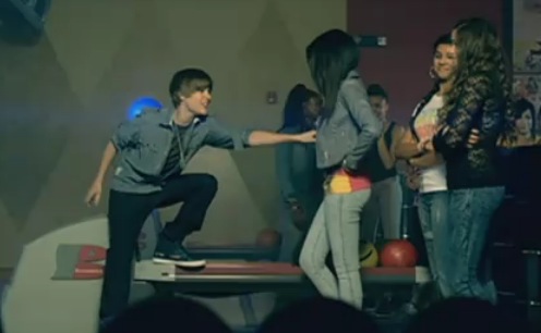 Anyway, moving on.  So after he tries to grope her, which would be illegal if they were grown-ups but they’re not so it’s just fucked up instead, she shoves him away again and goes to sit down somewhere else.  Naturally, like any well-adjusted man with restraining orders in his future, he goes to sit next to her, but wait there’s more.  She, despite all her shoving and scornful faces (which Justin interprets as Jailbait for “I want you”) runs away again.  At this point, the entire rest of the bowling alley is starting to see what’s happening, as demonstrated by Kid With Flat Top who is hanging out with Drake and they shake their heads and point.  Did I mention that Drake is here?  Yeah, Drake’s here.  He just hangs out on the sidelines and doesn’t say anything and is disappointed.  Here’s that happening.