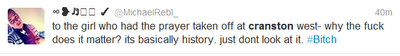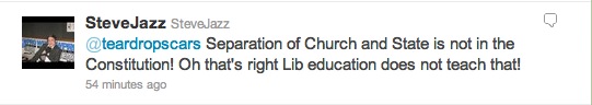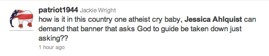 I don’t have any screenshots of this, because as far as I can tell, they don’t exist. I went through the first ten pages of Google results and found atheists defending her, objective news reports, and bigots attacking her, but nothing from Christians saying, “You know what? I love Jesus, and I love praying to him, but I respect that my religion is a private matter that should stay out of the public square, and that the Constitution mandates as such.” Not once have I seen that said, about any case like this. Just like you never see moderate Muslims saying that suicide bombers are extremists who’ve gotten it wrong.