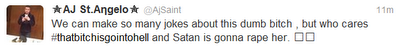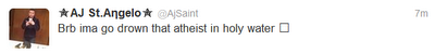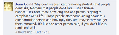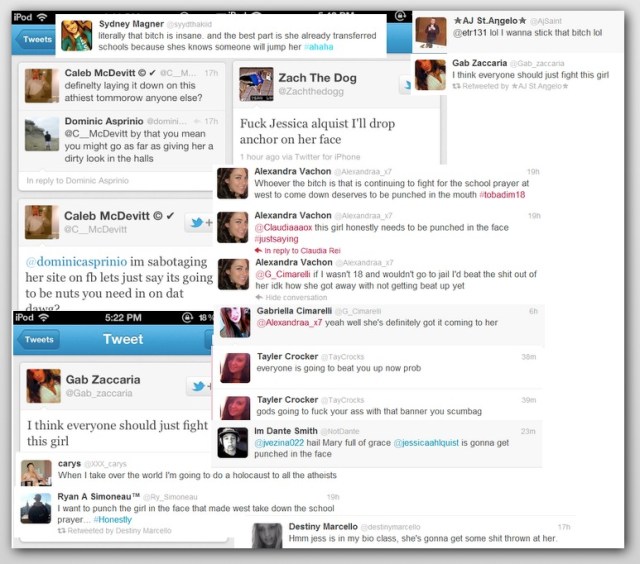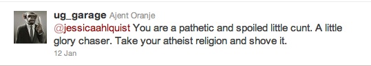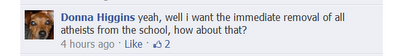 Well, this is pretty simple. Being an atheist is not illegal, nor is being ugly (which she’s not). Go through that last status and replace “atheists” with “Jews” and tell me how you think that would go over.
