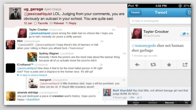 Over the past few days, Twitter and Facebook have lit up with horrific insults, responses to those insults, responses to the responses, etc. The worst of them, not by its content but by its source, came from Rhode Island State Representative Peter Palumbo, who called Jessica Ahlquist “an evil little thing” and followed it with, “Poor thing. And it’s not her fault. She’s being trained to be like that…she’s being coerced by evil people.” That’s an elected official at the state level saying, essentially, that atheists are evil.