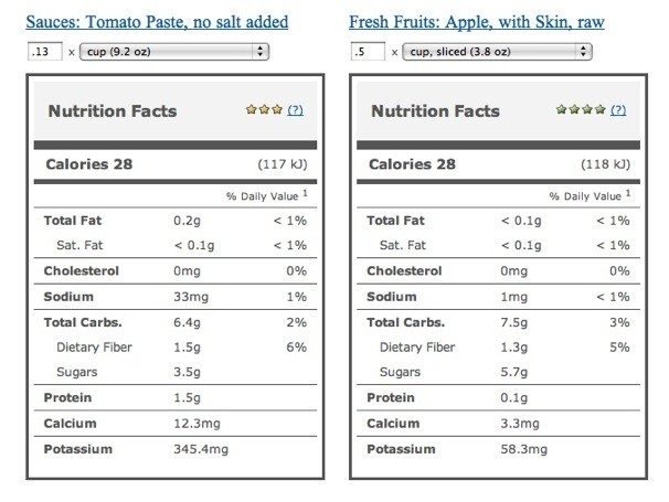 But the more fundamental issue is whether an eighth of a cup of tomato paste should count as being just as vegetabley as a half-cup of other fruits or vegetables. Let’s see how they stack up to apples, for example.
