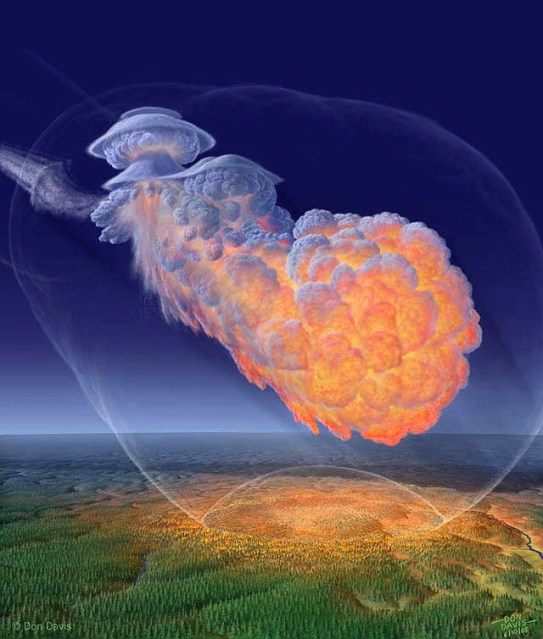 Remember 2012 DA14? Space rock number one from up above? In 1908, a rock about that size came through the atmosphere over Tunguska (remember what I said about Russian names?) and exploded about five miles above the Earth. That’s ten times the size of the Chelyabinsk meteor and a third the distance from the ground. It detonated with a force a thousand times stronger than the bomb dropped on Hiroshima, and probably looked something like this.
