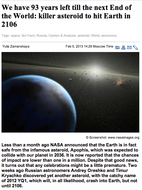 The second space rock on our list is called 2012 YQ1. Here’s how a “news” site called The Voice Of Russia decided to report this particular story.