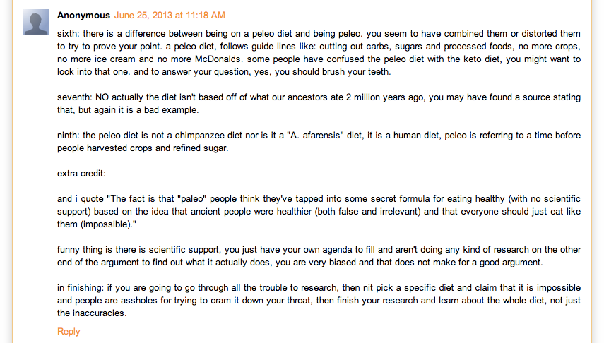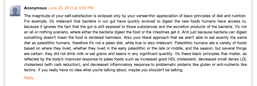 I am not basing my understanding of the diet on that one guy on Facebook. He’s not a good example, and I shouldn’t have used it, but he came up while I was writing and seemed like an entertaining extra point to add. Lots of people seem to have skimmed the article, assumed that all six points were based on the strawman that that one person didn’t eat paleo properly and so the whole thing is bunk, and then written me an email to that effect. Such is obviously not the case, which is why a few paragraphs later I used the sentence “And it’s not just this one guy’s breakfast,” followed by a long list of supposedly paleo foods and the earliest known dates of their consumption. And the other points (paleolithic people actually did eat grains, their bodies are not like ours, they weren’t that healthy anyway, etc.) still stand.