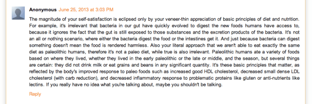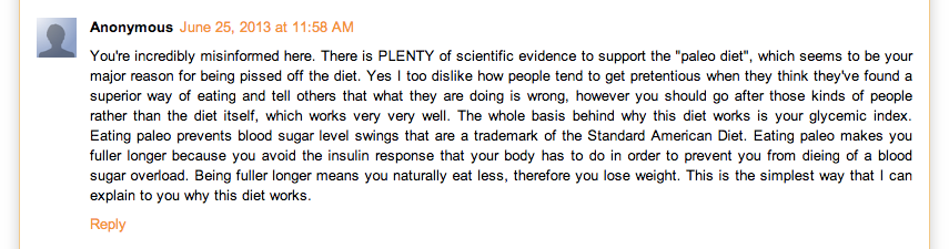 Besides, you’ll notice that he says nothing about the health of certain foods outside of their effects on your appetite. So anyone with the willpower to just, I don’t know, eat less would experience the same health benefits of the paleo diet. Like that guy a few paragraphs back who ate mainly Twinkies and lost 27 pounds. As far as this commenter’s point goes, the paleo diet is just an appetite suppressor. Which I don’t think is what they were going for.