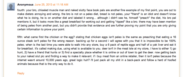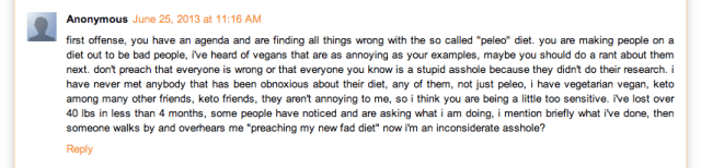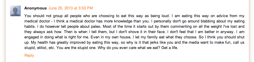 And finally, there’s this part: “why is it that jerks like you and the media want to make fun, call us stupid, elitist, etc.” This demonstrates how truly confused this person is, since as far as I can tell the media collectively fellates the proponents of any new alternative diet. And I sure as shit am not calling you elitist. That would mean you’re entitled and feel superior (apparently true), but normally people who feel superior don’t complain so much.