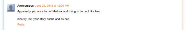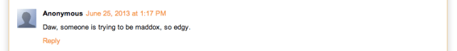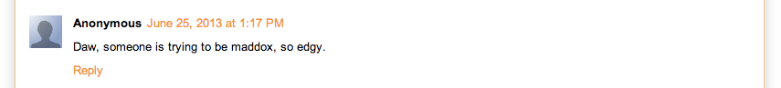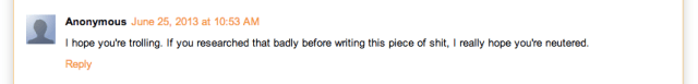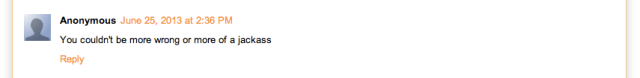 This one was followed by a response from another anonymous commenter inviting the original commenter to “suck your own dick, bitch.” That doesn’t really contribute to the conversation but I thought it was funny.