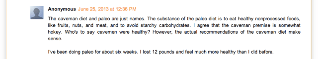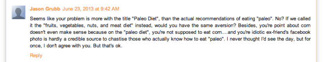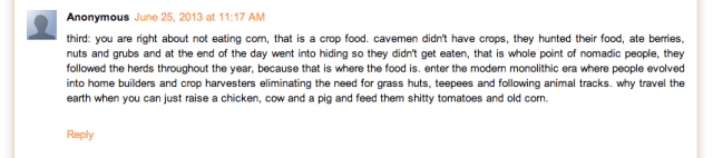 This guy is actually a friend of mine, and I’ll just paraphrase my response to him. I know you can’t eat corn on the paleo diet (although as per Sylvia’s comment, corn isn’t evil either). I chose corn as an example to show how drastically human foods have changed in the last few millennia. And yes, my beef is mainly with the name. But it’s more than that. The fact is that “paleo” people think they’ve tapped into some secret formula based on the idea that ancient people were healthier and that everyone should just eat like them. The “fruits, vegetables, nuts, and meat diet” may indeed be a viable way to maintain health, but there’s no reason to think it’s the perfect way to eat, and there’s certainly no reason to defend it on the grounds that our ancestors ate that way.