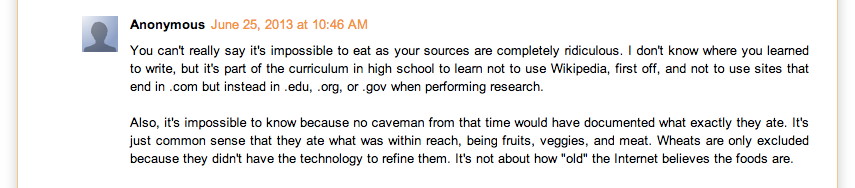 I also know that the screenshot I took is not a perfect example, but it doesn’t change the fact that “those who actually know how to eat ‘paleo’” do not exist. That’s why I used so many more examples in the post, to point out that there are NO foods available today that paleolithic man could have eaten. If the premise of the paleo diet is “I eat like this because paleolithic man ate like this” — and you’d be hard pressed to argue that such is not the premise of the diet — then it doesn’t have a leg to stand on. There simply is no way to eat the foods that paleolithic humans ate because every food we eat, along with humanity itself, has evolved enormously since then.
