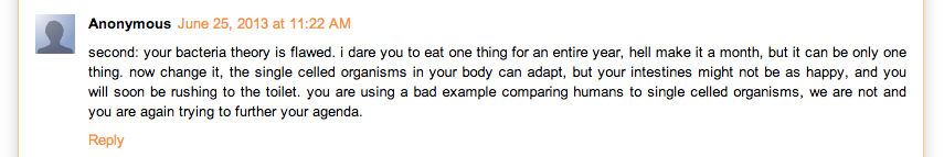 This comment needs some dissection, so I’ll go through it. First, he says that it’s irrelevant that the bacteria in our gut have evolved to digest our new foods because the gut is still exposed to those byproducts. That’s a fundamental misunderstanding of the nature of a symbiotic relationship. If we die, the bacteria have no food source. If they die, we can’t use the food we eat. The bacteria in the human gut evolve alongside us and our changing diets, and they only stay in there because they work. If one of those species suddenly evolved to produce cyanide, it would rapidly kill its host and that’d be the end of that branch of the evolutionary tree. He also points out that just because bacteria can digest something doesn’t mean it’s harmless, which is true. And a total non-sequitur. See symbiosis above.