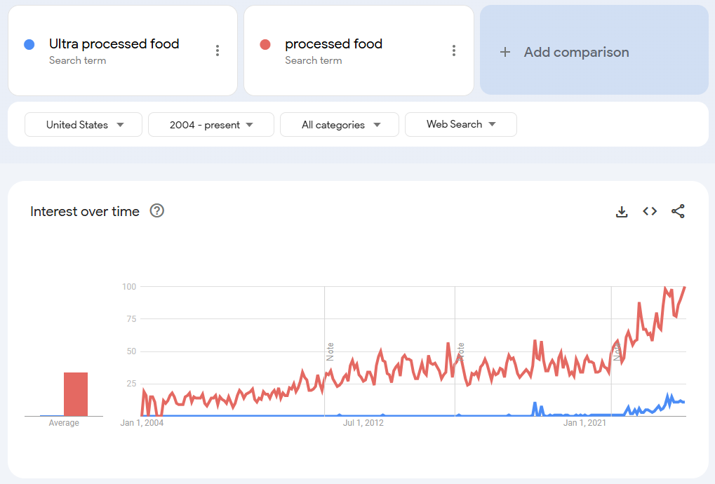 There are a few problems with this. First, despite this definition coming out in 2009, the phrase “ultra processed food” has only caught on in the last couple of years, and just barely:
